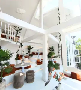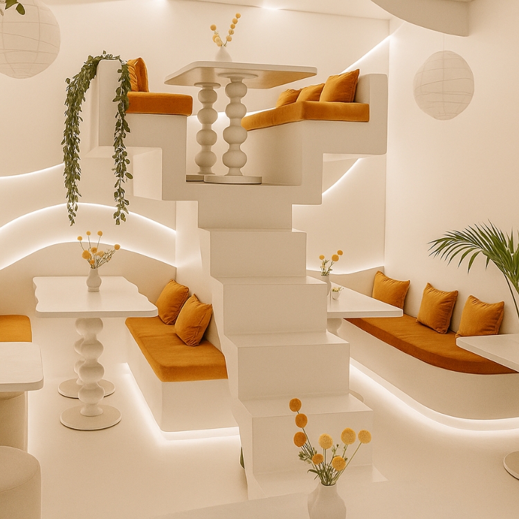 Perched above it all, the Sky Table gives you the best light and view in the house. White walls meet greenery, LEDs add depth, and every angle feels made for photos.