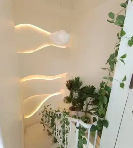 White matte walls, warm LED strips, and tropical details set the tone for our “Japandi tropical fusion.” Organic wood, terracotta cushions, and hanging plants make it both calm and alive.